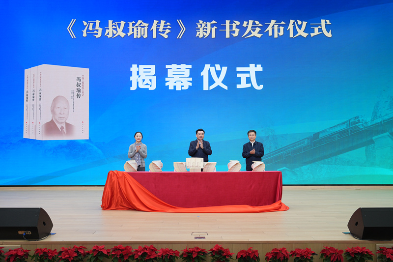 在会场全体人员的共同见证下,谢先启、张志方、唐海英为《冯叔瑜传》揭幕,两套《冯叔瑜传》交由全国“科学家精神教育基地”铁科院院史馆、铁路行业最大的专业图书馆和科技文献中心铁科院图书馆永久收藏。